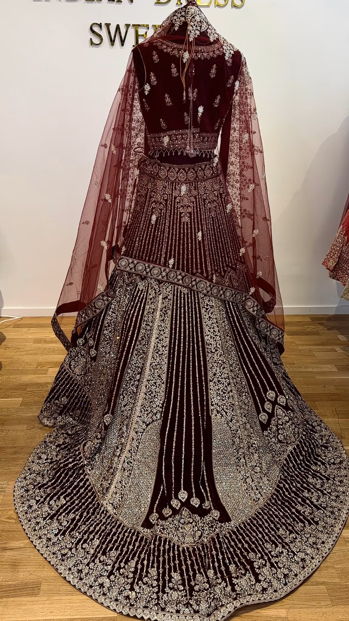Bridal lehenga maroon 6 900 kr Beautiful maroon lehenga in velvet fabric full of work and with tail size M In stock Buy now Share Stock: 1 Article Number: 1171 Information Beautiful maroon lehenga in velvet fabric full of work and with tail size M