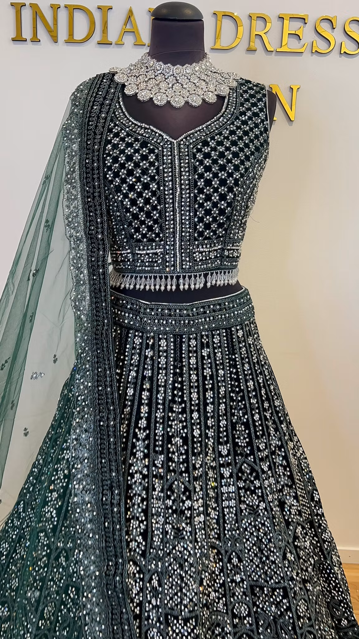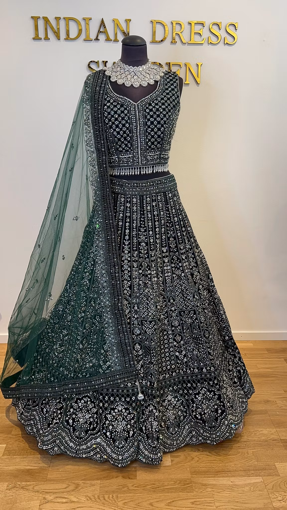 Lehenga bottle green 5 500 kr Beautiful lehenga full of work in velvet fabric size M In stock Buy now Share Stock: 1 Article Number: 883 Information Beautiful lehenga full of work in velvet fabric size M